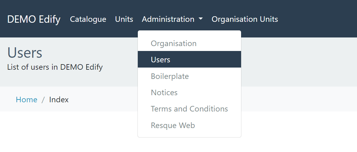 - Click, Administration → Users. This will present a list of all Users within your Organisation.