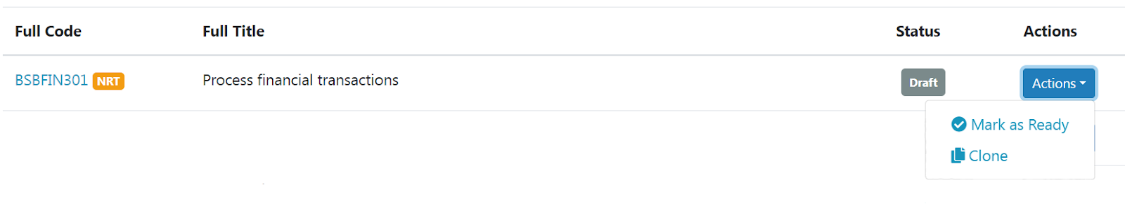 Creating a new NRT unit will pull unit details and information from training.gov.au. However, Assessment sections, Mapping and some Supporting info will be blank.