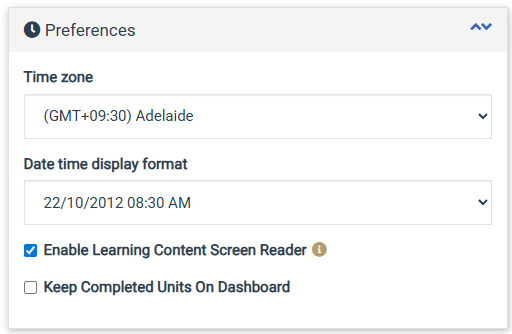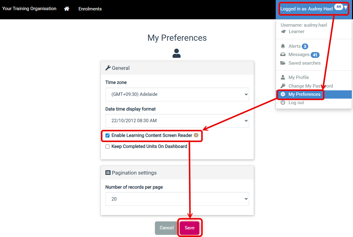 Students can activate the screen reader functionality themselves by navigating to their Logged in menu, followed by My Preferences, and then the Enable Learning Content Screen Reader option. Remember to click Save!