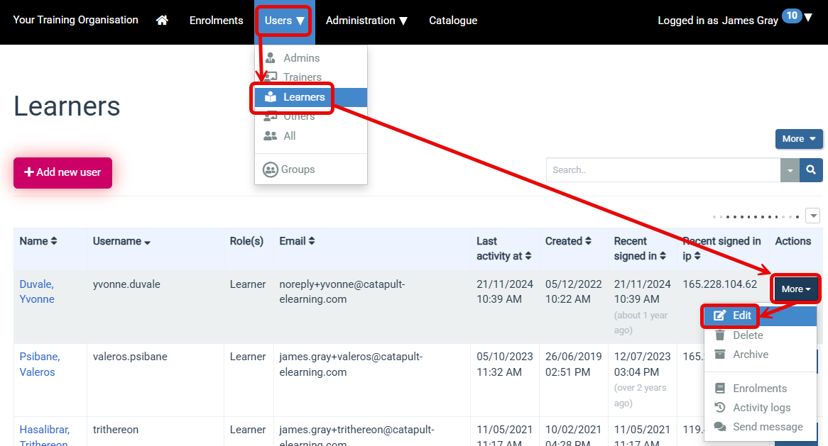 Admins can activate the screen reader functionality on a per-student basis by clicking Users > Learners, locating the student of your choice, and then clicking More > Edit...