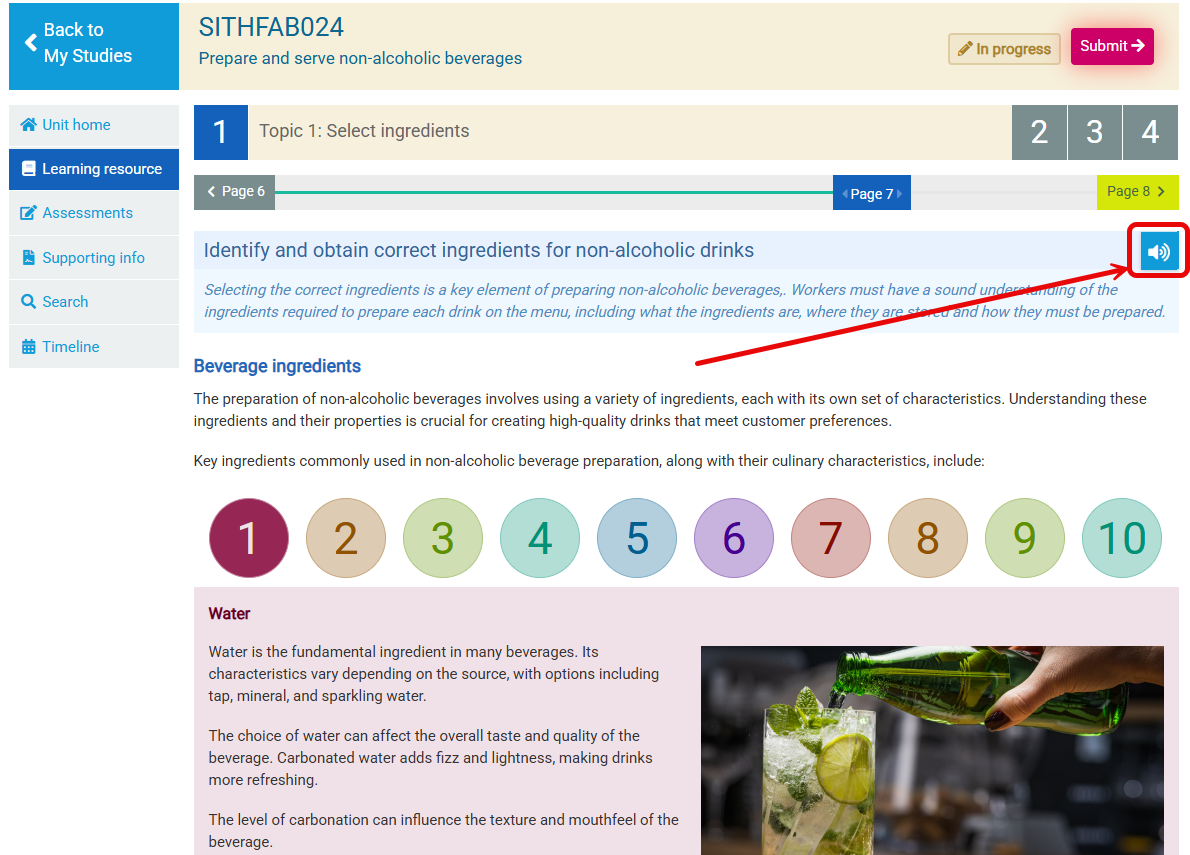 When this button is clicked, your browser will start reading aloud the contents of the learning material, starting with the page heading (in this case, "Identify and obtain correct ingredients").